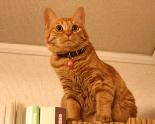 洋室の本棚の一番高いところに駆け登っちゃいました。